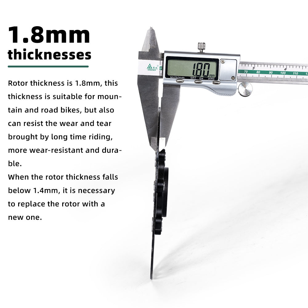 Rotor thickness is 1.8mm, this thickness is suitable for mountain and road bikes, but also can resist the wear and tear brought by long time riding, more wear-resistant and durable.